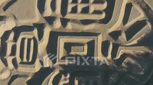 香川県観音寺市の琴弾公園 銭形砂絵の砂ざらえの直後を空撮 寛永通宝
